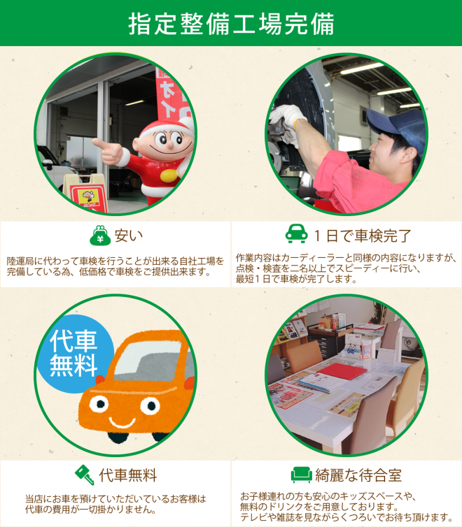オイル交換からタイヤ交換、鈑金から車検まで、車周りのことなら全てお任せ頂けます!お客様のカーライフを徹底的にサポートさせて頂きます!